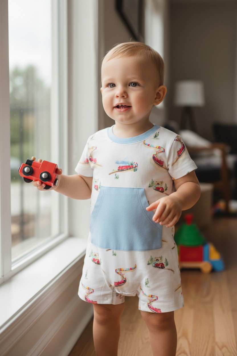 Our Train themed short onsie with cute pocket has the benefits of snaps for quick diaper changes for your active baby.  Enjoy the benefits of soft Hypoallergenic bamboo that is OEKO-TEX® certified.